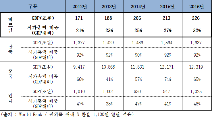 역시 아직까지는 베트남이 가장 낮습니다. '17년 베트남의 GDP대비 시가총액 비율은 인도네시아 수준인 50%까지 상승했습니다.