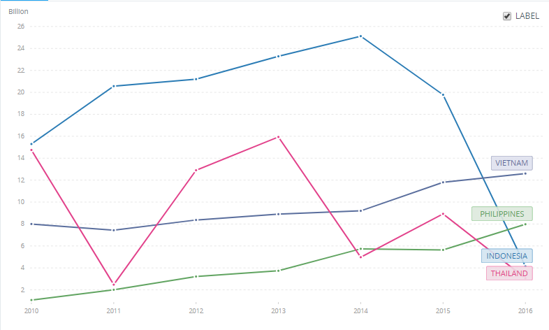 제가 선택한 베트남의 경제지표는 중국, 태국, 인도네시아, 필리핀의 동일 지표와 비교해 보고자 했습니다.(아래의 자료들의 출처는 World bank Data 입니다. 아직 2017년 Data가 업데이트 안되어서 2016년 Data기준으로 정리했습니다.)