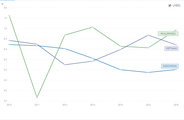 GDP 성장률은 중국을 제외하고 다른 동남아시아 국가들만 비교해 보았는데, 인도네시아는 계속 하락하고 있으며 필리핀은 등락을 거듭하다가 '16년에는 가장 높은 성장률을 보였으며 베트남은 '12년부터 계속 성장하다가 '16년에 하락하는 모습을 보여주었습니다.