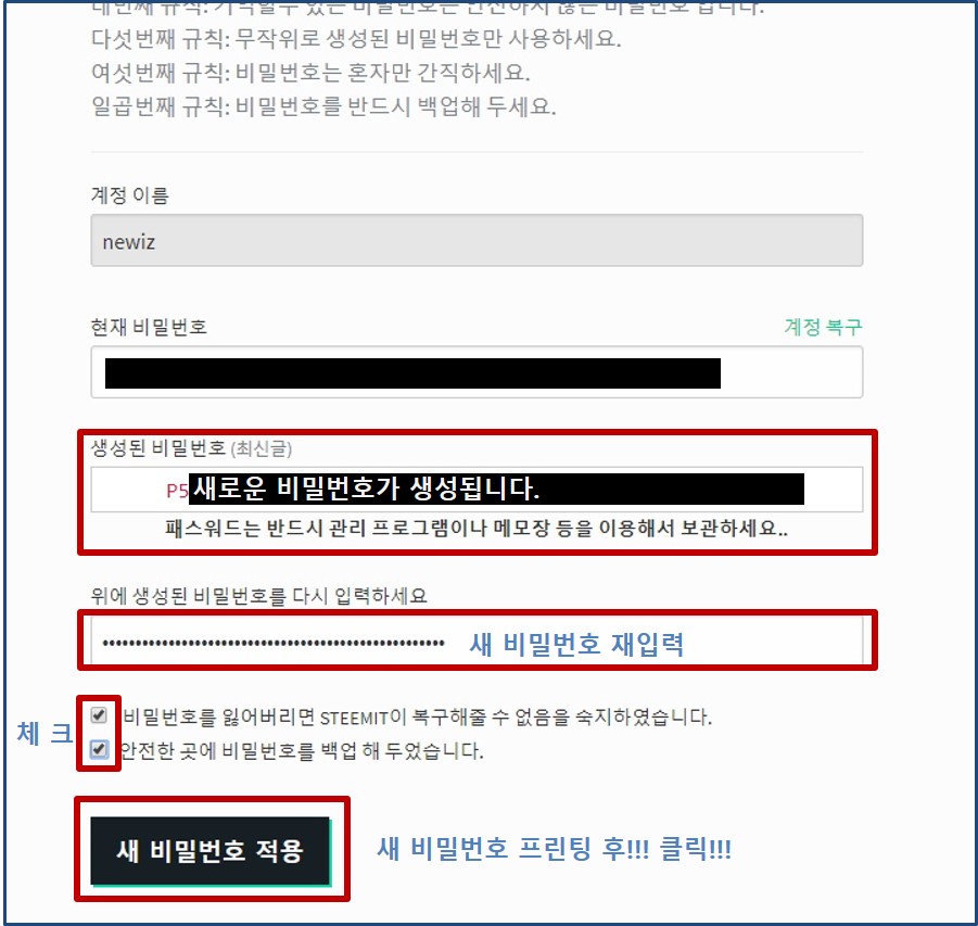 ⑦ 숙지사항에 체크를 한 후, [새 비밀번호 적용]을 클릭합니다.