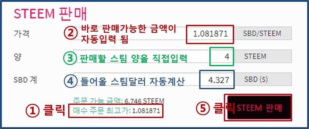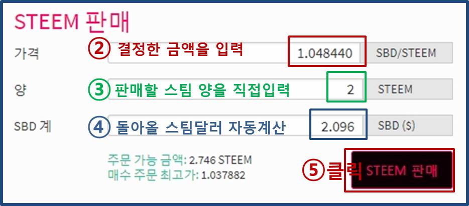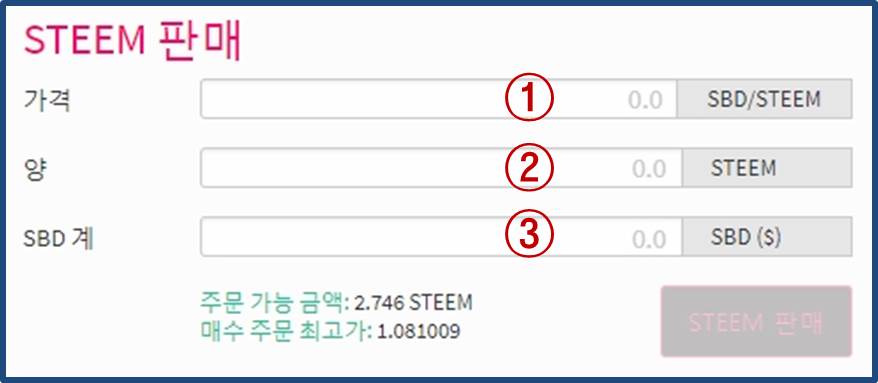 ⑧ STEEM매도 주문 입력란입니다.