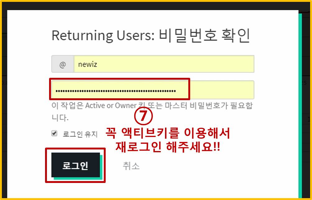 ② 스팀 = 상품(or 주식)거래소에서 거래를 하려면 [오너키] 혹은 [액티브키]가 필요합니다.
