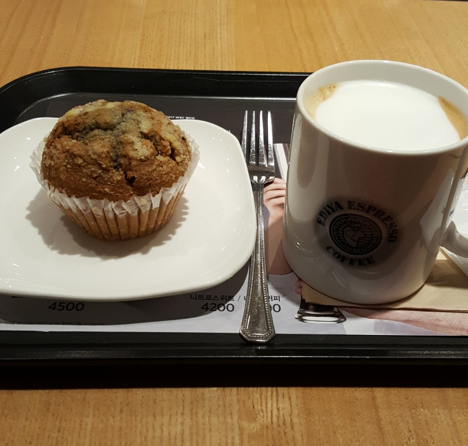 라떼 한잔에 블루베리 머핀하나를 주문하고...