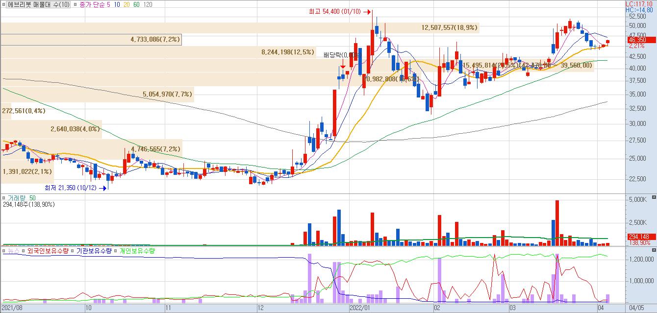 2022년4월5일 에브리봇steemCreated with Sketch.nightofwin (35)in #kr • 4 years ago (edited) 멀티플 PER 27.47 PBR 4.93 멀티플은 다시 역사적 고점에 근접 BM 로봇물청소기 - 95% 직접 개발 흡입식로봇청소기 - 5% 수입 판매 모델 판매지역 국내 - 87% 해외 - 12% 특이사항 자체 공장이 없고 제품은 외주로 생산함 삼성전자에 로봇청소기 공급 흡입형 로봇청소기와 무선청소기로 사업 확장 중 2021년 부터 배당 지급(350원) 삼성전자, LG전자, 현대차 등 대기업의 로봇 적극 투자에 로봇주 강세 #stock #stockchart #ma20
