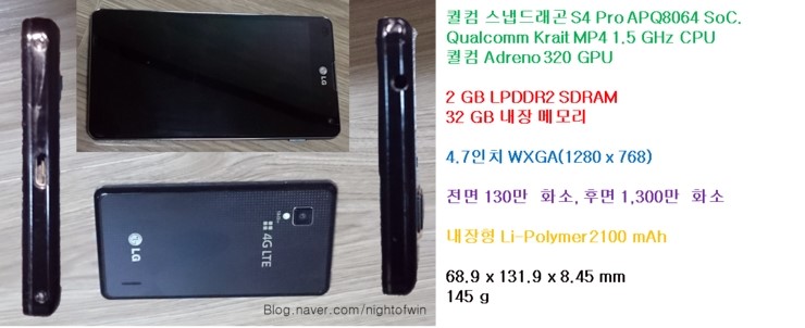옵티머스G와 넥서스4는 같은 시기 LG에서 만든 폰이라 외양과 작은 차이를 제외한 대부분이 같은 기기다.