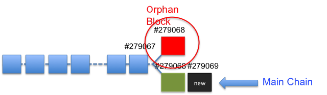 그리고 2차 체인으로 분류된 빨간색 블록은 고아블록 (Orphan Block)이라고 하며, 한마디로 낙동강 오리알이 되버린다. 빨간색 블록을 채굴한 사람은 당연히, 채굴보상을 받을 수 없다. 기록은 있으나 메인체인에 유지되지 않은 기록은 아무 의미 없기 때문이다.