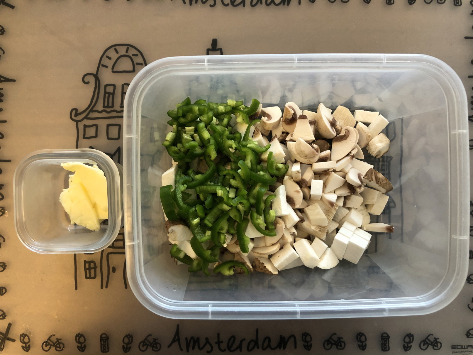 아까 썰어 놓은 버섯과 아삭이고추 넣어