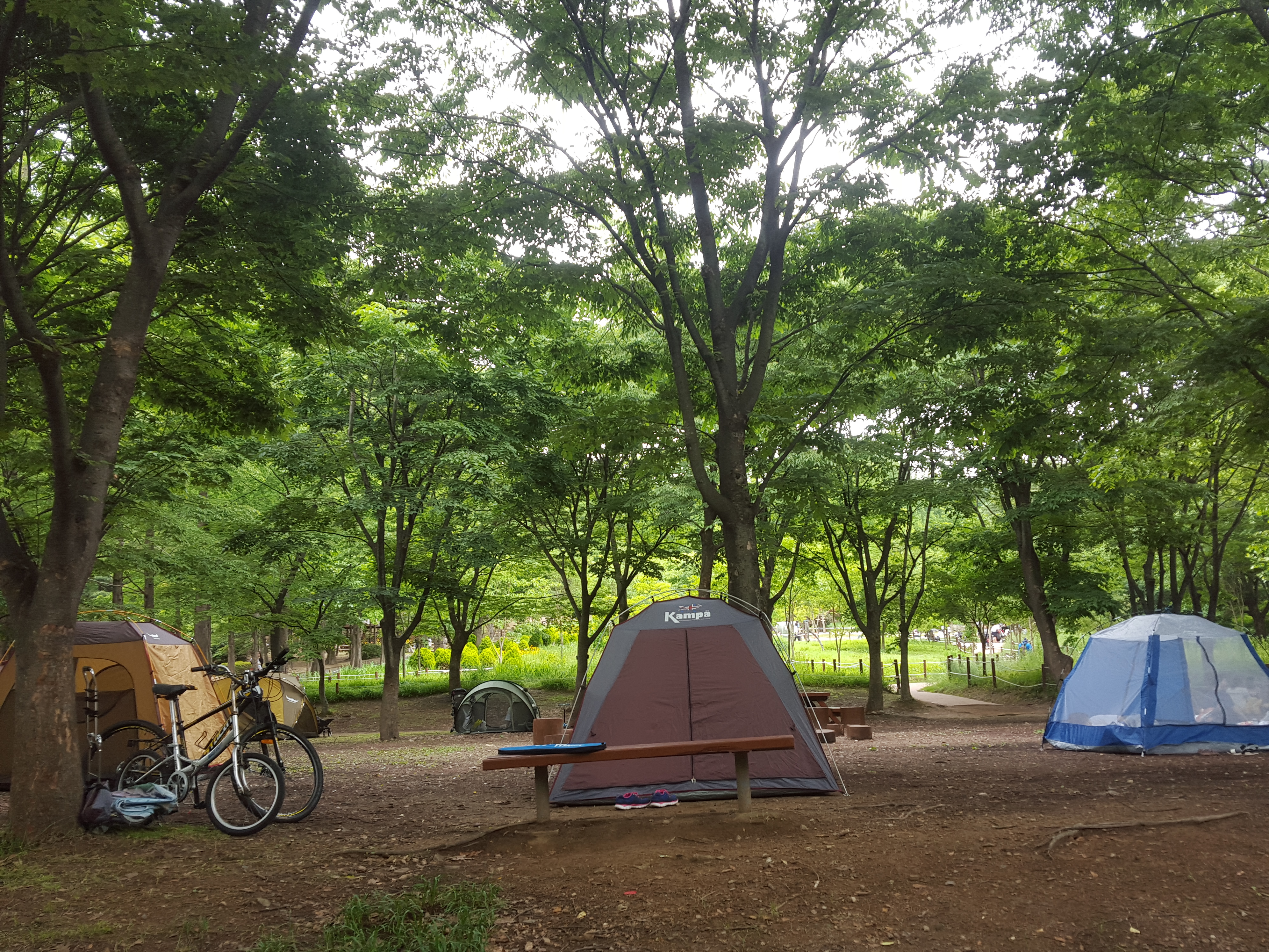 텐트를 치고 산림욕을 즐기고 있습니다.