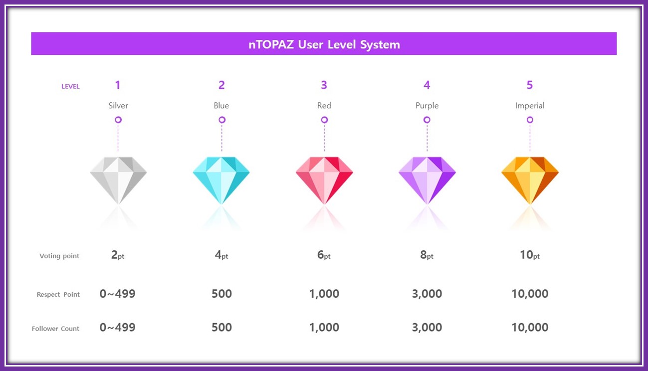 [ 콘테스트 수상횟수 x 금(+100pt)/은(+60pt)/동(+40pt), 뱃지 수상횟수 x (+30pt)] - 레벨 승급시 보너스 [ Red(1,000TPZ), Purple(3,000TPZ), Imperial(10,000TPZ)]