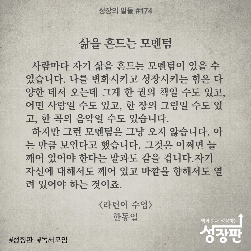 사람마다 자기 삶을 흔드는 모멘텀이 있을 수 있습니다. 나를 변화시키고 성장시키는 힘은 다양한 데서 오는데 그게 한 권의 책일 수도 있고, 어떤 사람일 수도 있고, 한 장의 그림일 수도 있고, 한 곡의 음악일 수도 있습니다.