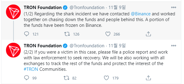 사기꾼의 트위터 주소는 https://twitter.com/shark_tron 이며, 사기꾼 지갑의 주소는