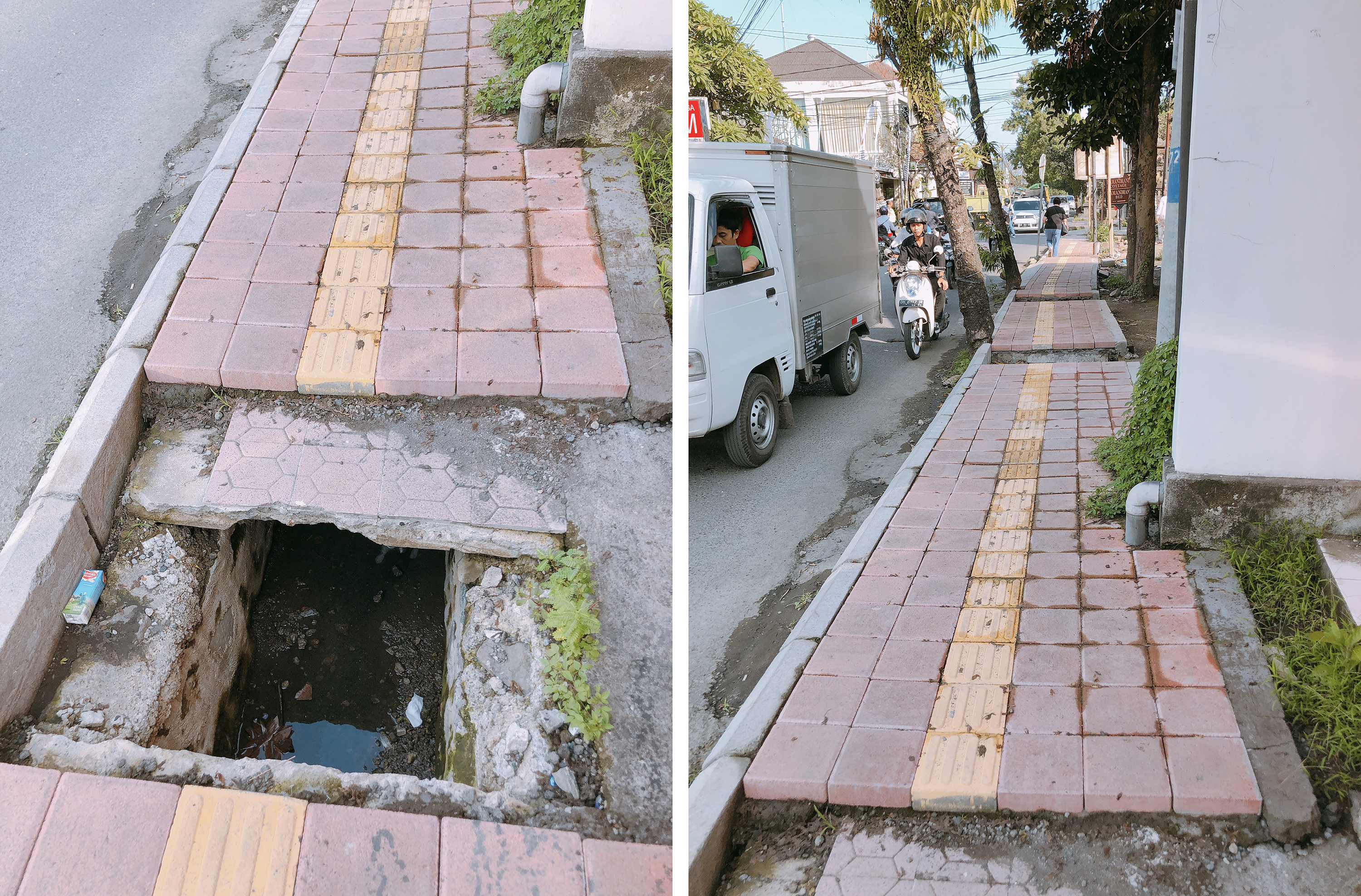 발리의, 정확히는 우붓의 길 곳곳에는 구멍이 많았다. 가게와 가게 사이로 블럭 정비가 되지 않아 끝나는 지점마다 구멍이 보였다. 뻥 뚫린 구멍 아래로, 하수구와 여러가지 쓰레기들이 눈에 들어왔다. 그냥 끌고 가면 10분이면 도착했을 것을 몇 십 키로 짜리 짐을 끌고 울퉁불퉁하고 구멍 뚫린 길을, 그것도 차와 오토바이가 꽉 들어찬 도로 옆을 가고 있자니 점점 이건 아니라는 생각이 들기 시작했다. 그래도 이미 출발해 버렸으니 어쩔 수가 없다. 조금만 더 가보자며 돈존은 또 여행가서 하면 안 될 짓을 갱신해가고 있었다.