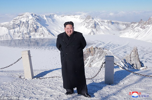 On Tuesday, US Secretary of Accompaniment Rex Tillerson said Washington was accessible to allocution to Pyongyang 'without preconditions', interpreted by abounding as a about-face in the US position. Pictured: North Korean absolutist Kim Jong-Un aloft Mount Paektu