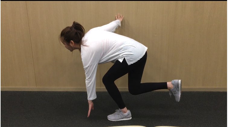 지탱한 다리를 서서히 내리면서 무릎을 굽혀준다. - 앞으로 뻗은 팔의 손끝이