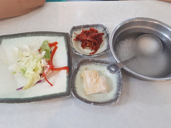 위는 기본 반찬들 입니다. 샐러드, 백김치, 명태 식해, 동치미 육수 (동치미 육수는 동치미 막국수에 넣어 먹습니다.)