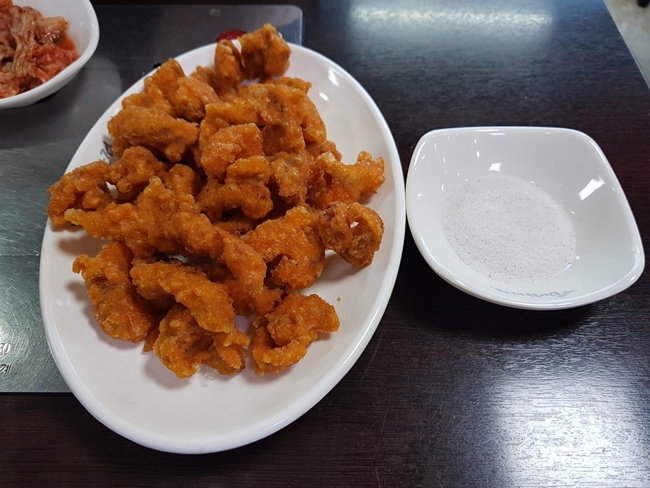 색깔 보고 처음에는 소고기 튀김인 줄 알았습니다. ㅎㅎ 그리고, 소스가 따로 있는 줄 알았는데, 소금을 찍어 먹는다고 하더라구요?