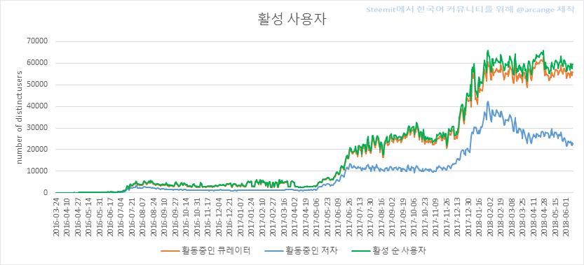 스팀잇 통계자료 – 2018.06.12.위 그래프를 보면 2017년 하반기(6월~12월)에 활동중인 저자가 대략 10,000명, 그리고 2018년 들어서 활동중인 저자가 대략 20,000명 정도로 수렴(40,000명에서 낮아짐)하고 있는 것을 확인할 수 있습니다. 이는 백만명의 가입자대비 2%정도만이 적극적으로 포스팅을 하고 있다는 것입니다. 그렇다면 한국의 경우는 어떠할까요?