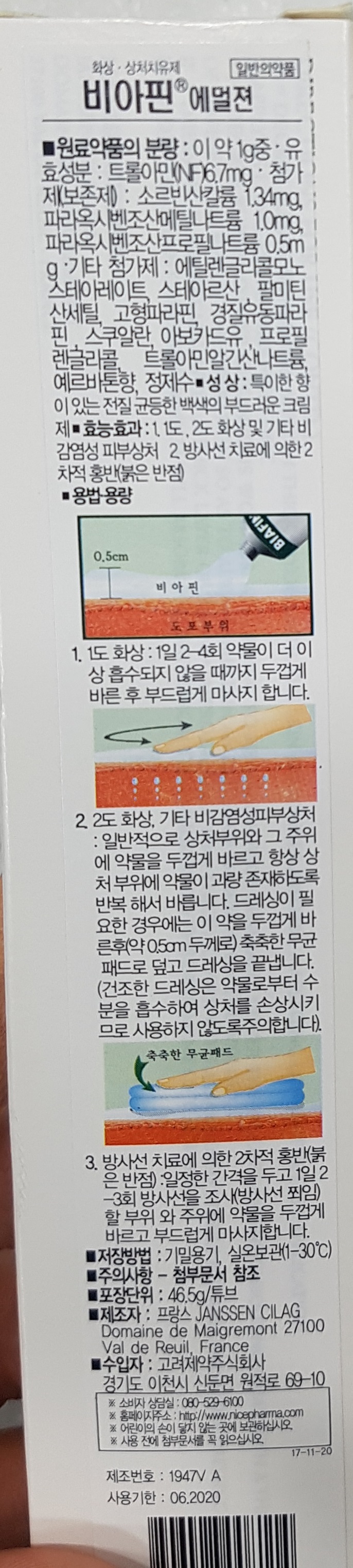 약국 최애템 시리즈의 두번째 제품은 화상연고 비아핀 에멀젼®(일반의약품)입니다! 뜨거운 햇볕으로 가벼운 일광화상을 입었을 때는 물론이고, 일상생활에서 겪게 되는 여러 화상 상처에 사용할 수 있는 연고이지요. 프랑스에서는 집집마다 가정상비약처럼 구비하고 있는 의약품이라고 합니다.