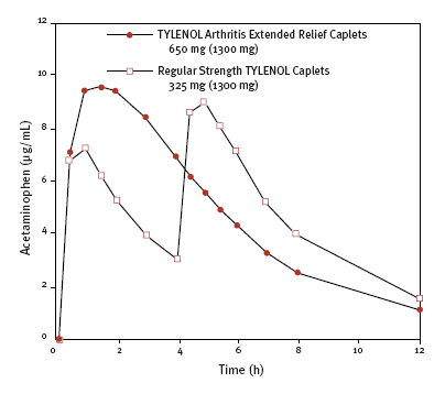 FIGURE. Mean plasma concentrations of acetaminophen in 24 male subjects following oral administration of 1300 mg acetaminophen dosed as either two caplets of TYLENOL®(acetaminophen) Arthritis Extended Relief or four Regular Strength TYLENOL®acetaminophen (two caplets given at 0 and 4 hours).
