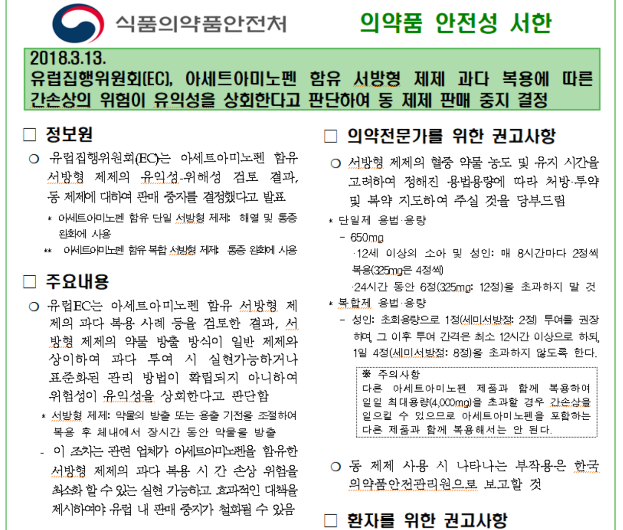 “유럽 의약품청 EMA는 아세트아미노펜 성분 자체는 유익성이 위험성을 상회한다고 평가하나, 환자가 고의 또는 과실로 과다하게 용량을 복용하였을 때 용량이 많은 서방형 제제가 더 위험할 수 있으므로, 용량이 적은 일반형 제제만을 시장에 판매 허용해 두고 서방형 제제의 경우 과다복용에 대한 안전 대책이 마련되면 판매 중지를 철회해 보도록 유럽집행위원회 EC에서 결정함”