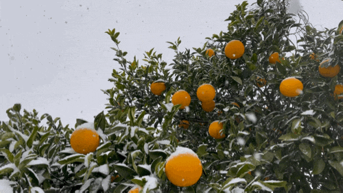 노란 하귤 위로 하얀눈이 쌓여있는 모습은
