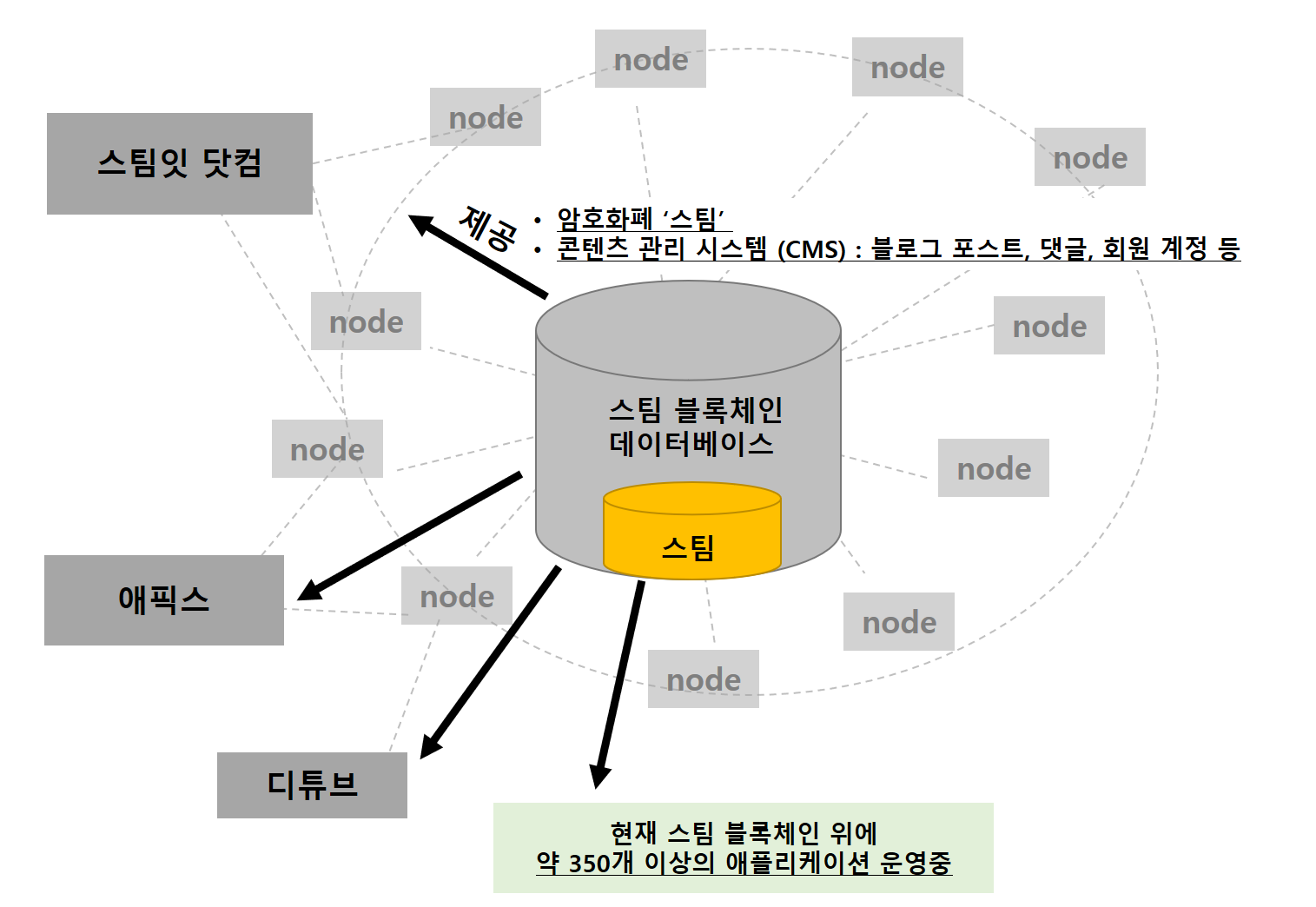 휴대폰의 안드로이드, IOS 체제 위에 만들어지는 중앙 집중적인 앱과 달리 이더리움/스팀 등 블록체인 플랫폼 위에 만들어지는 어플이라고 이해하시면 쉬울 것이다.
