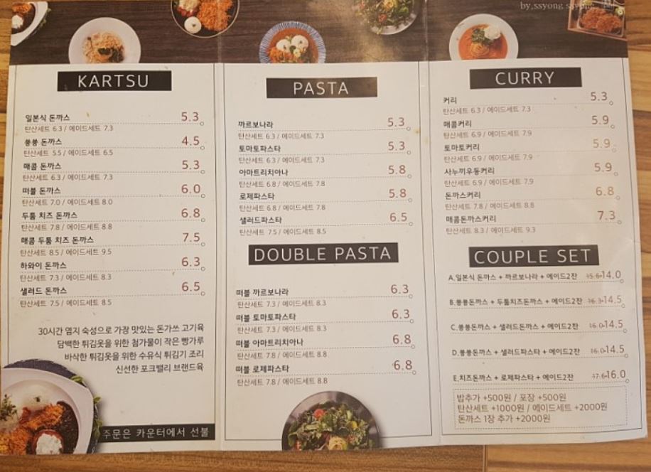 맛집 돈까스~ 생겼네요.pinkgirl (48)in #kr • 8 years ago (edited)우리동네에 새로운 돈까스 집이 생겨서 바로 달려가서 시식을 하고 왔습니다.~ 제가 좋아하는 샐러드가 있어서 너무좋았어요 ^^ 개인적으로는 매콤 돈까스가 맛나네요 ㅎㅎ 샐러드 돈까스 쑝쑝돈까스 샐러드파스타 ㅋㅋ 사진에는 샐러드 때문에 파스타가 안보이네요;; -매콤 돈까스 에이드(자몽.레몬) 상호: 쑝쑝돈까스 주소 : 부산 동구 고관로 111 #kr-newbie #jjangjjangman #muksteem #k-mom