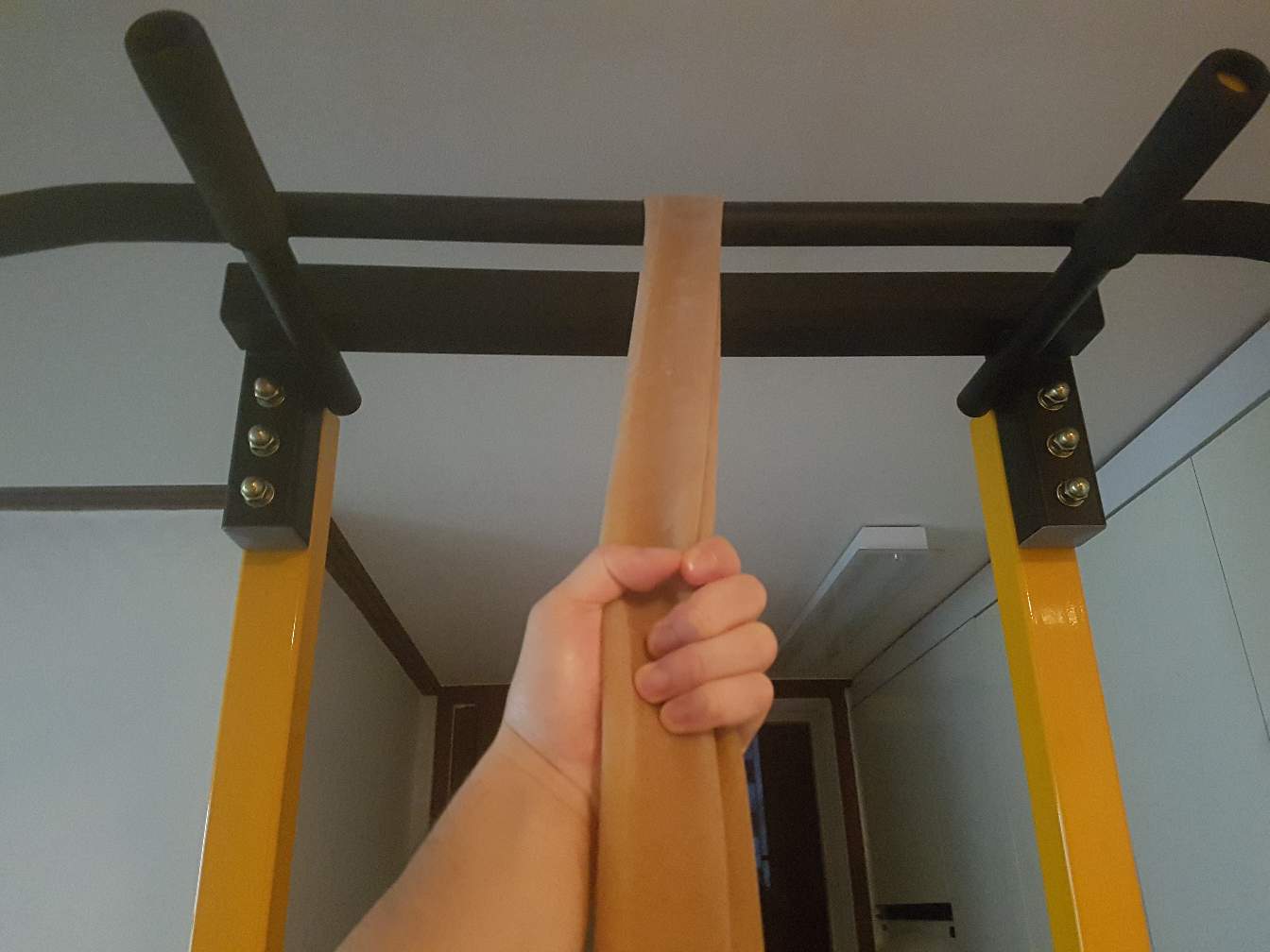 턱걸이 하는 철봉을 배경으로,