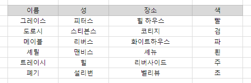 다음조건으로 여섯여성의 성과 이름 , 사는 곳 과 좋아하는 색깔을 추론하시오