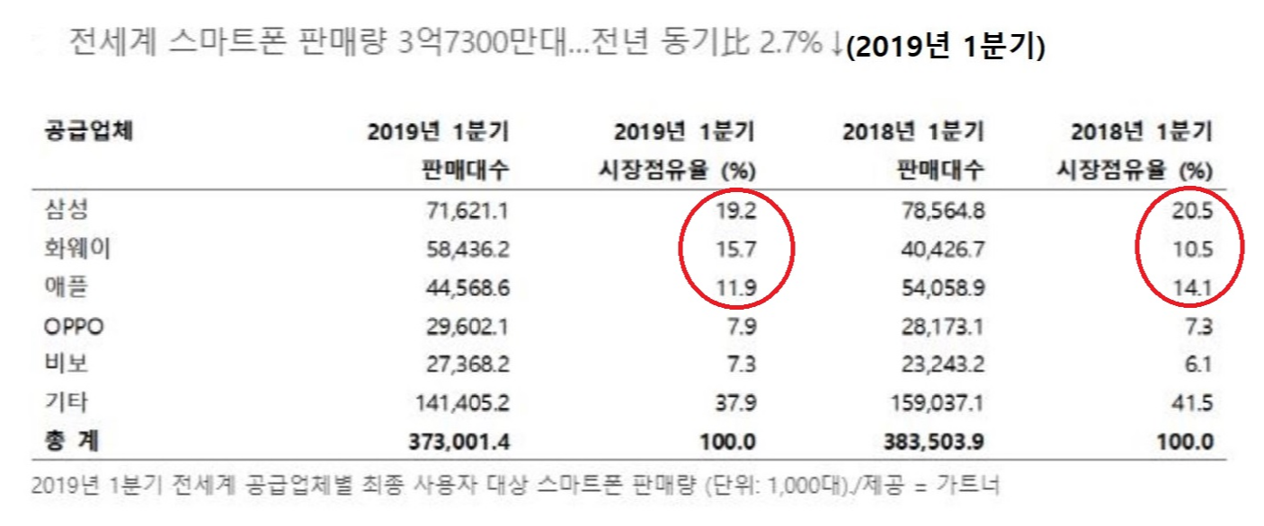 지 선언할 경우 애플실적이 30% 정도 하락할 것으로 예상한다. 여하튼 향후 中화웨이의 스마트폰 수출은 차질(蹉跌)이 불가피할 것으로 전망된다. 위 그림에서 보듯이 올해 1분기 스마트 폰 Global 시장점유율이 전년 동기대비 삼성과 애플은 감소하는 반면에 中화웨이는 급증(10.5→15.7%)을 나타낸다.