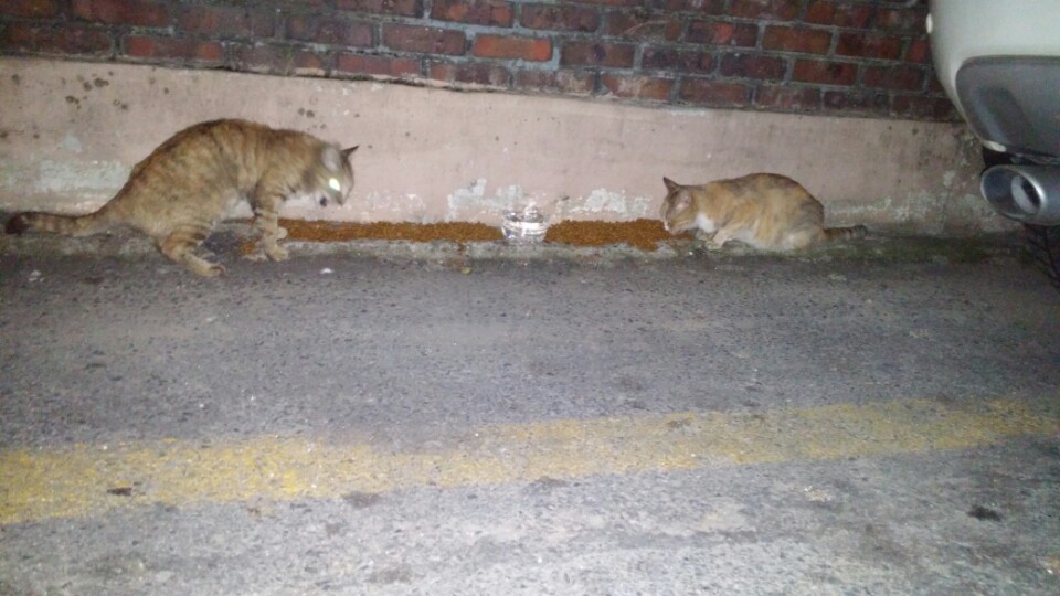 그러자 차체 아래에 숨어있던 녀석도 주춤주춤하면서 나와서 식사를 했습니다.