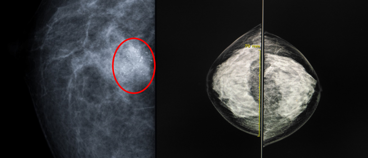 (우) 유선 조직의 밀도가 너무 높아 병변의 발견에 제한이 있다.