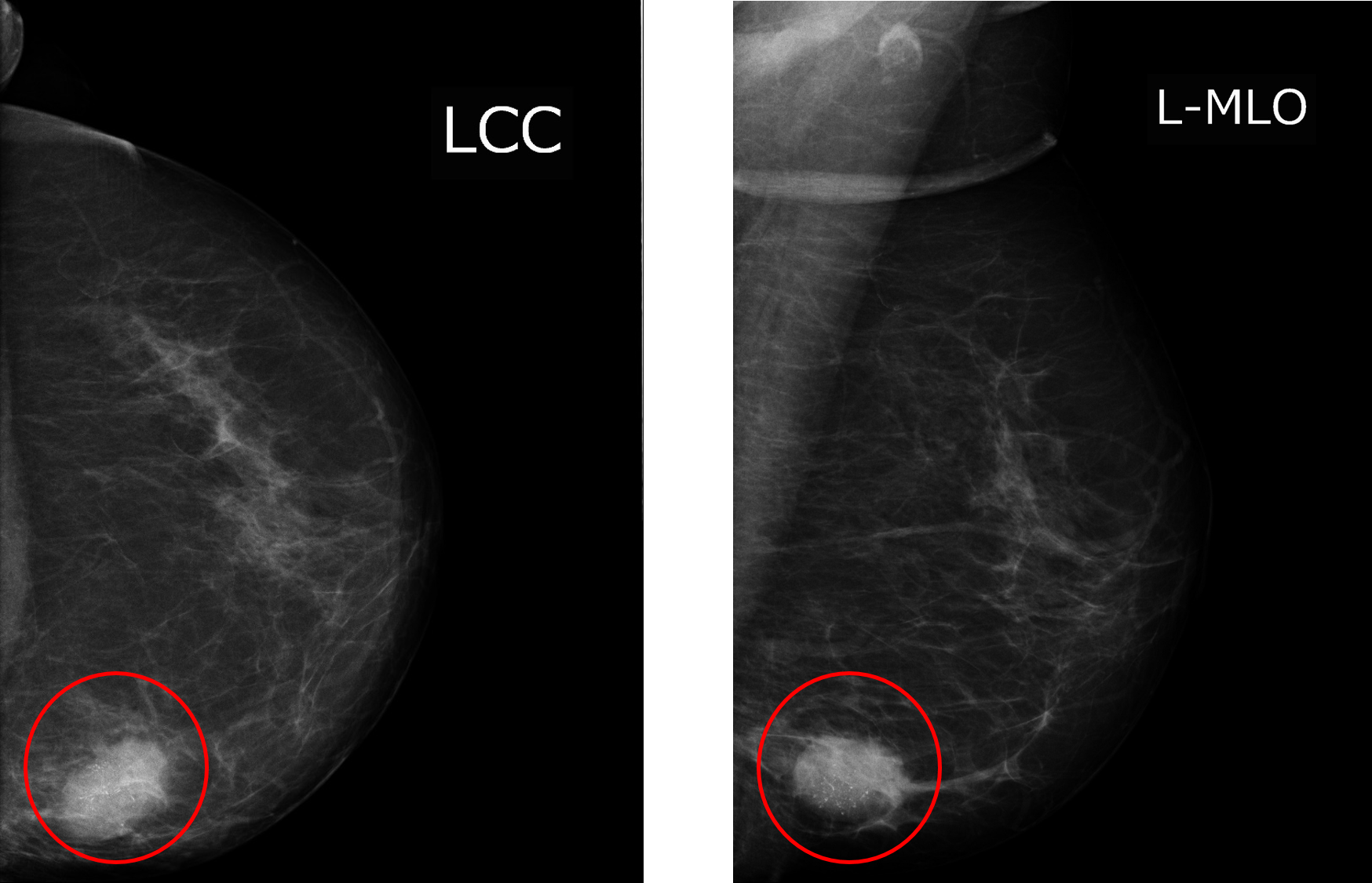 <예> 위 사진은 왼쪽 유방촬영술입니다. 내부의 검은 부분은 대개 지방이고, 넓게 펼쳐진 하얀 부분은 유선 조직입니다. MLO에서 안쪽의 하얀 막대 모양은 대흉근 입니다. 빨간 동그라미로 표시된 하얀색 병변은 나머지 정상 조직과 차이가 있음을 알 수 있습니다. 병변은 CC view에서 아래쪽, MLO view에서 아래쪽이므로 ‘왼쪽 유방의 Lower Inner Quadrant’위치 이므로 Lt. LIQ라고 위치를 말할 수 있습니다.
