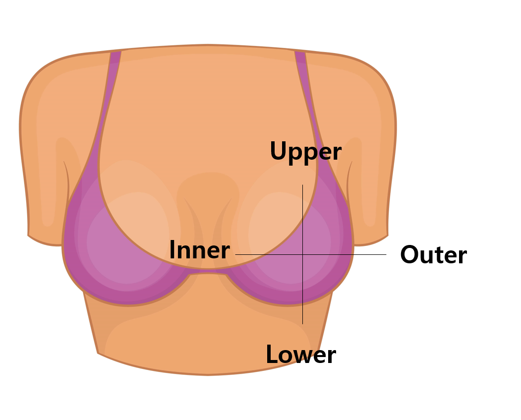 병변의 위치를 정하는 방법을 간단히 말씀 드리면, 젖꼭지(nipple)을 기준으로 사분면을 그려 위는 upper, 아래는 lower, 안쪽은 inner, 바깥쪽은 outer로 정합니다. 오른쪽 왼쪽을 정하고, 사분면을 칭하는 영어의 앞글자를 따 병변의 위치를 정합니다.