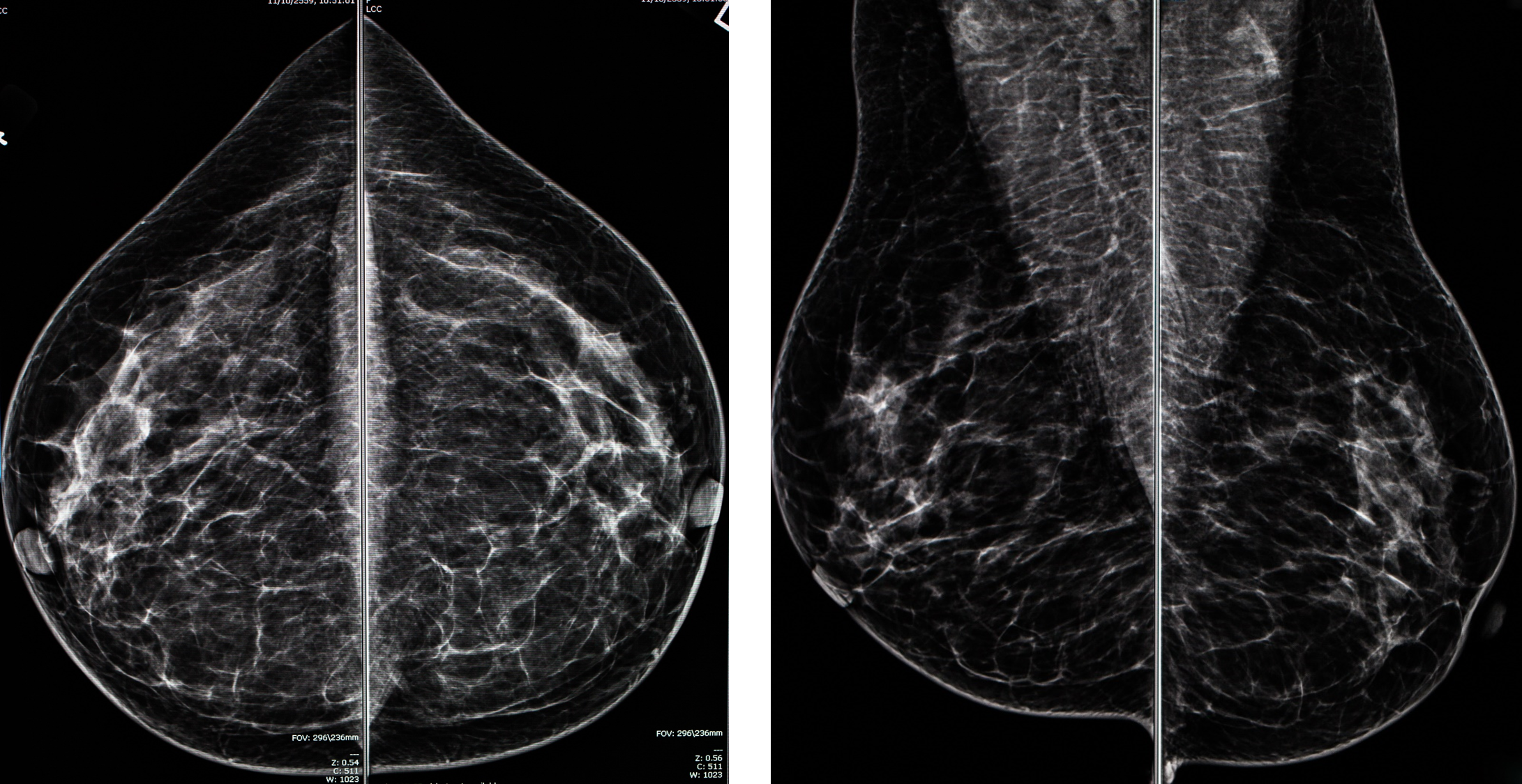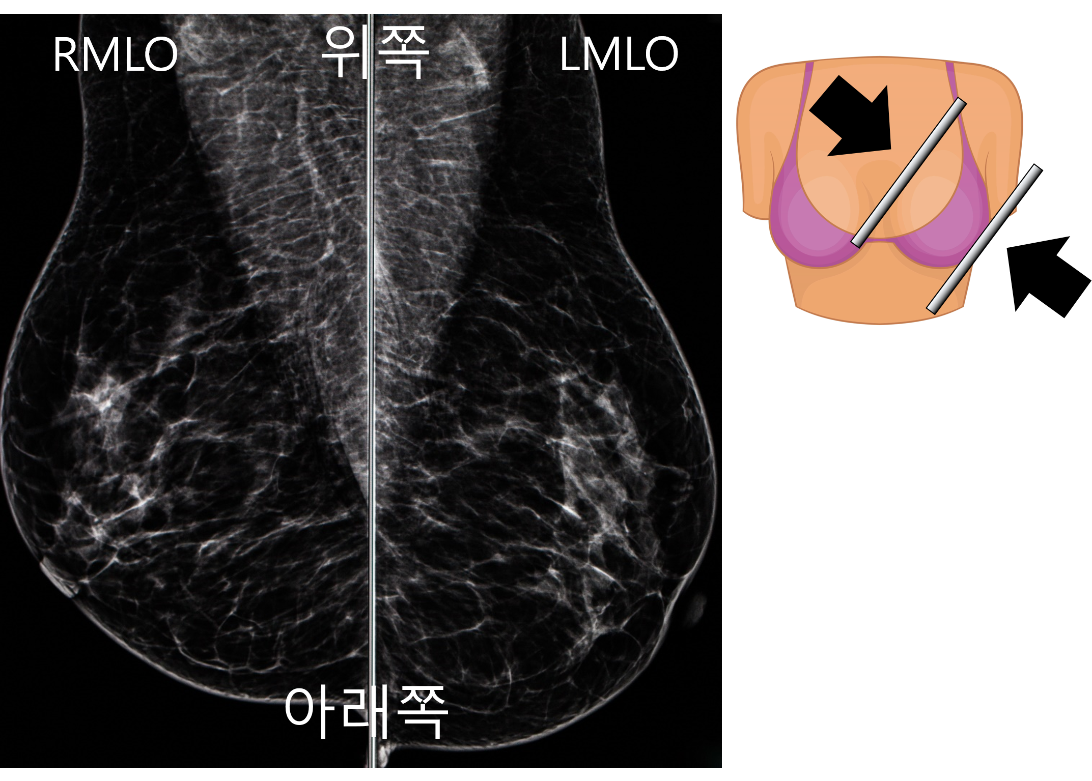 이 이미지는 오른쪽(R), 왼쪽(L) MLO(mediolateral oblique) view 입니다. 이는 유방을 안쪽 바깥쪽으로 압력을 주는데, 약간 비스듬히 압박 하는 방법입니다. 이 방법은 단일 촬영으로 가장 많은 유방조직을 보여줄 수 있습니다. 영상의 위가 유방의 위쪽, 아래가 유방의 아래쪽 입니다.