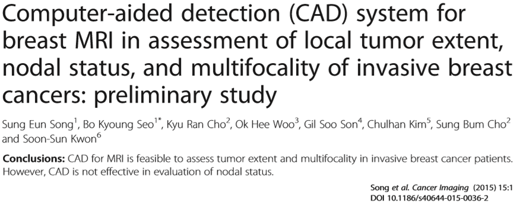 - Sung Eun Song et al. Computer-aided detection (CAD) system for breast MRI in assessment of local tumor extent, nodal status, and multifocality of invasive breast cancers: preliminary study. Cancer Imaging (2015) 15:1. [Open access, CC-BY]