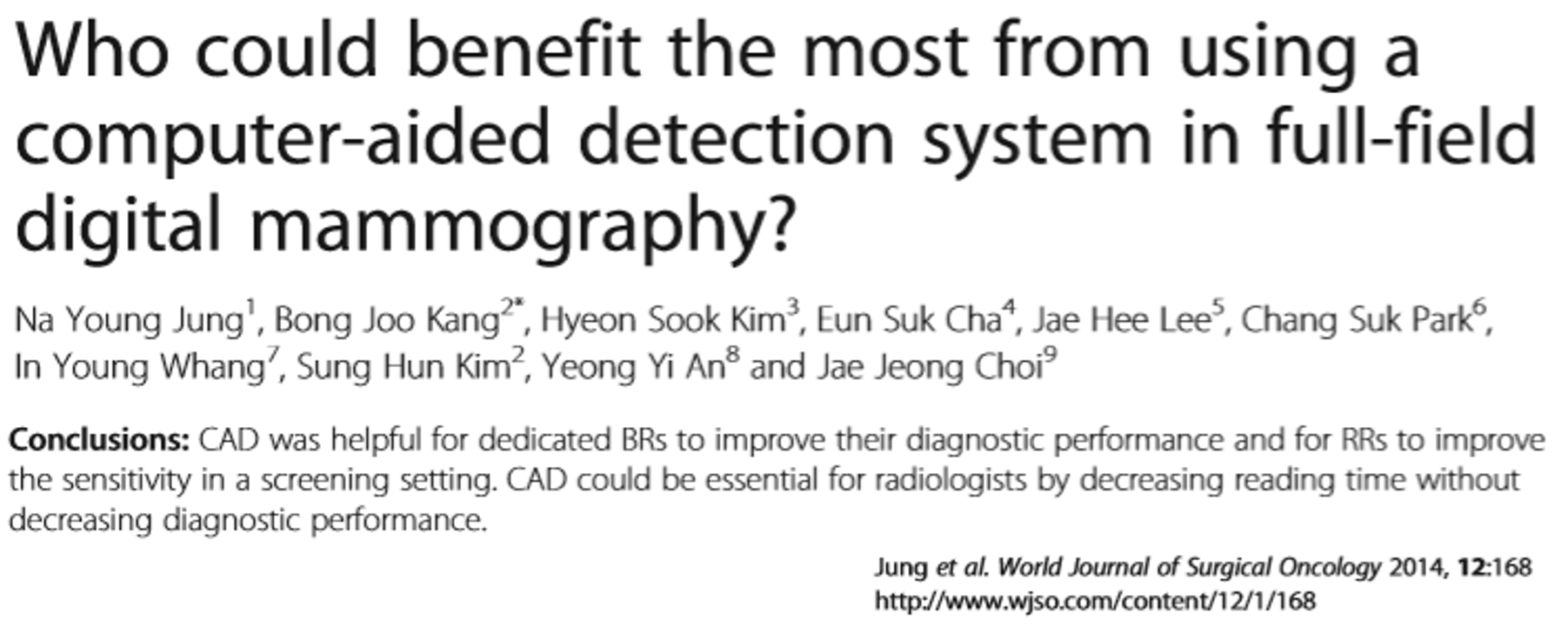- Na Young Jung et al. Who could benefit the most from using a computer-aided detection system in full-field digital mammography? World Journal of Surgical Oncology 2014, 12:168. [Open access, CC-BY]
