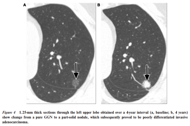 같은 결절의 변화. 왼쪽은 뿌옇게 보이는 pure GGO, 오른쪽은 4년 뒤 하얗게 변한 part-solid GGO(고형 성분이 생겼다는 말).