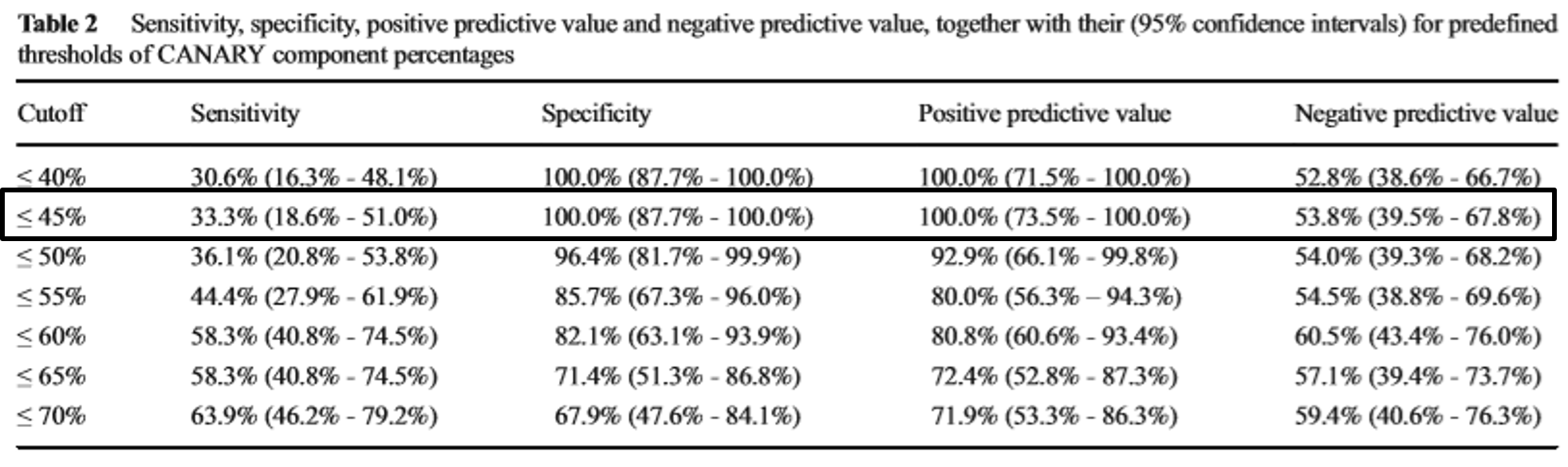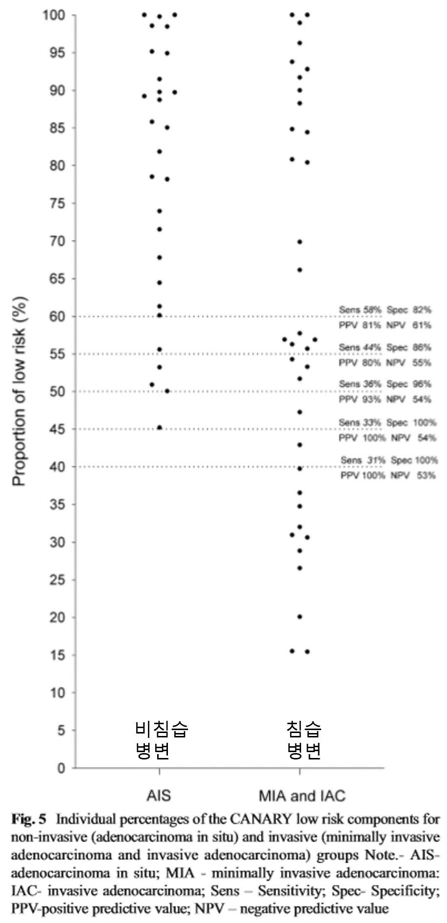 저위험도 퍼센테이지가 차지하는 기준 값은 45%에서 100%의 특이도와 양성 예측도를 보였습니다. 따라서 50% 미만의 값을 기준으로 하면 이 프로그램을 사용 하여 좋은 예측도를 보일 것으로 생각됩니다.