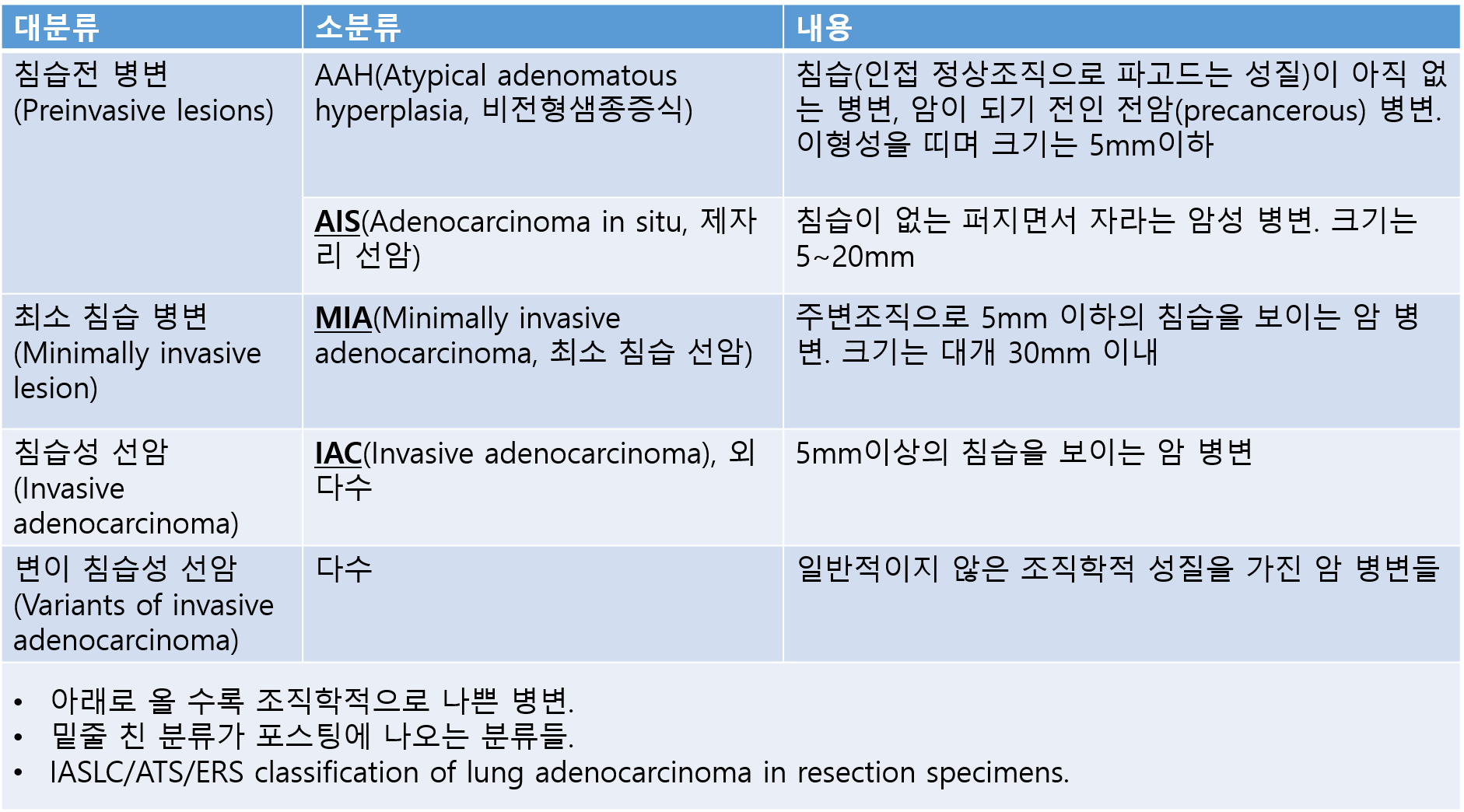 CT에서는 아래로 갈수록(조직학적으로 안좋을 수록) 크기가 커지고, 결절의 고형 성분이 많아져 CT density (CT에서 하얀 정도)가 올라갑니다. 그런데 고형 성분이 안보이는 pure GGO 결절은 조직학적 예측이 쉽지 않습니다.