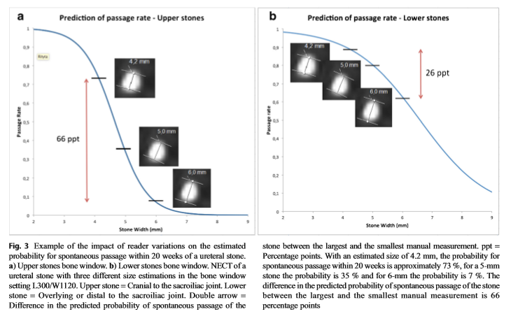 추가적으로 수동 측정법에 있어 3명의 영상의학과 의사간의 측정치 차이의 영향력을 언급하고 있는데, 이 근거는 첫번째 논문입니다. 아래 그림과 같이 상부 요로 결석의 경우 결석 크기에 따른 자연 배출률의 변화가 크기 때문에 조금의 오차만 있어도 큰 예측치의 차이를 보인다는 것을 알 수 있습니다. 결국 상부 요관 결석에 있어 판독자에 따라 자연 배출률 차이가 클 수 있다는 점을 말해줍니다. 그래서 이런 차이를 줄이기 위해서는 자동화된 측정을 사용 할 것을 제안하고 있습니다(수동이나 자동이나 예측력에 차이가 없으니까요).