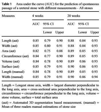 Prediction of spontaneous ureteral stone passage: Automated 3D-measurements perform equal to radiologists, and linear measurements equal to volumetric, Johan Jendeberg et al. European Radiology, https://doi.org/10.1007/s00330-017-5242-9