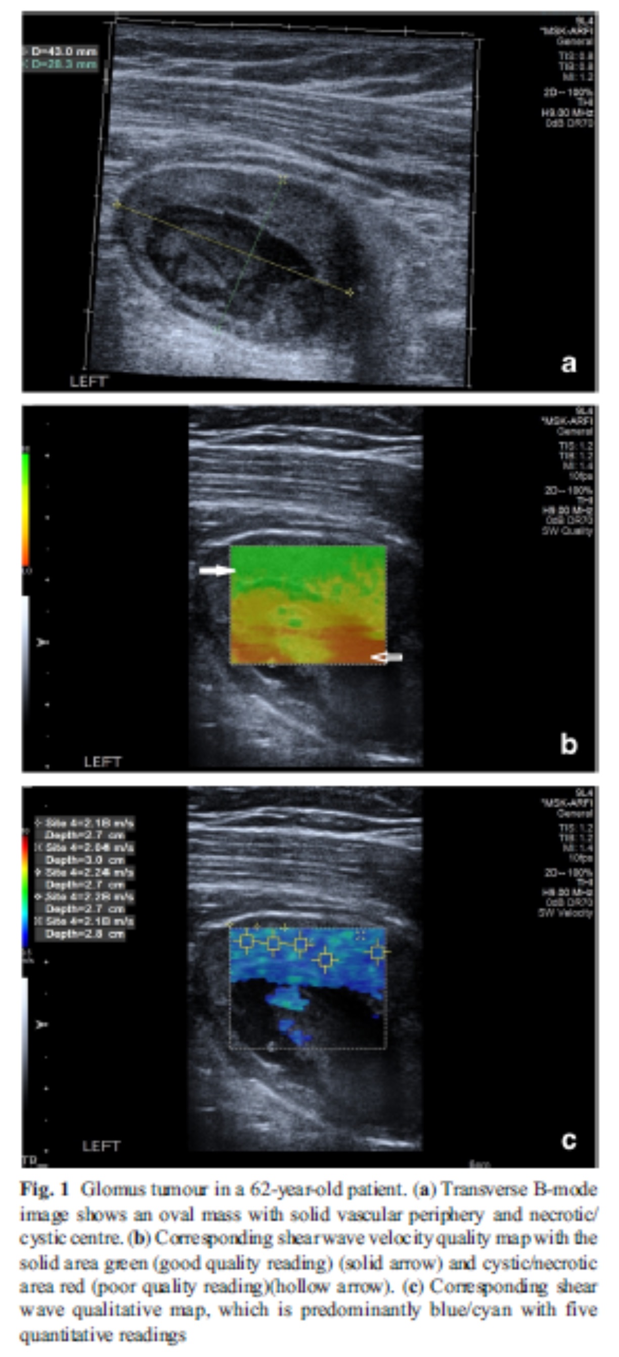 힘줄염이 있으면 정상보다 부드럽게 보이며 탄성초음파소견이 증상과 연관 있다고 알려집니다. 근육의 경우도 근염이나 신경근육질환이 있으면 섬유화로 인해 경직도가 증가되거나, 지방변성으로 경직도가 감소한다고 보고되고 있습니다.