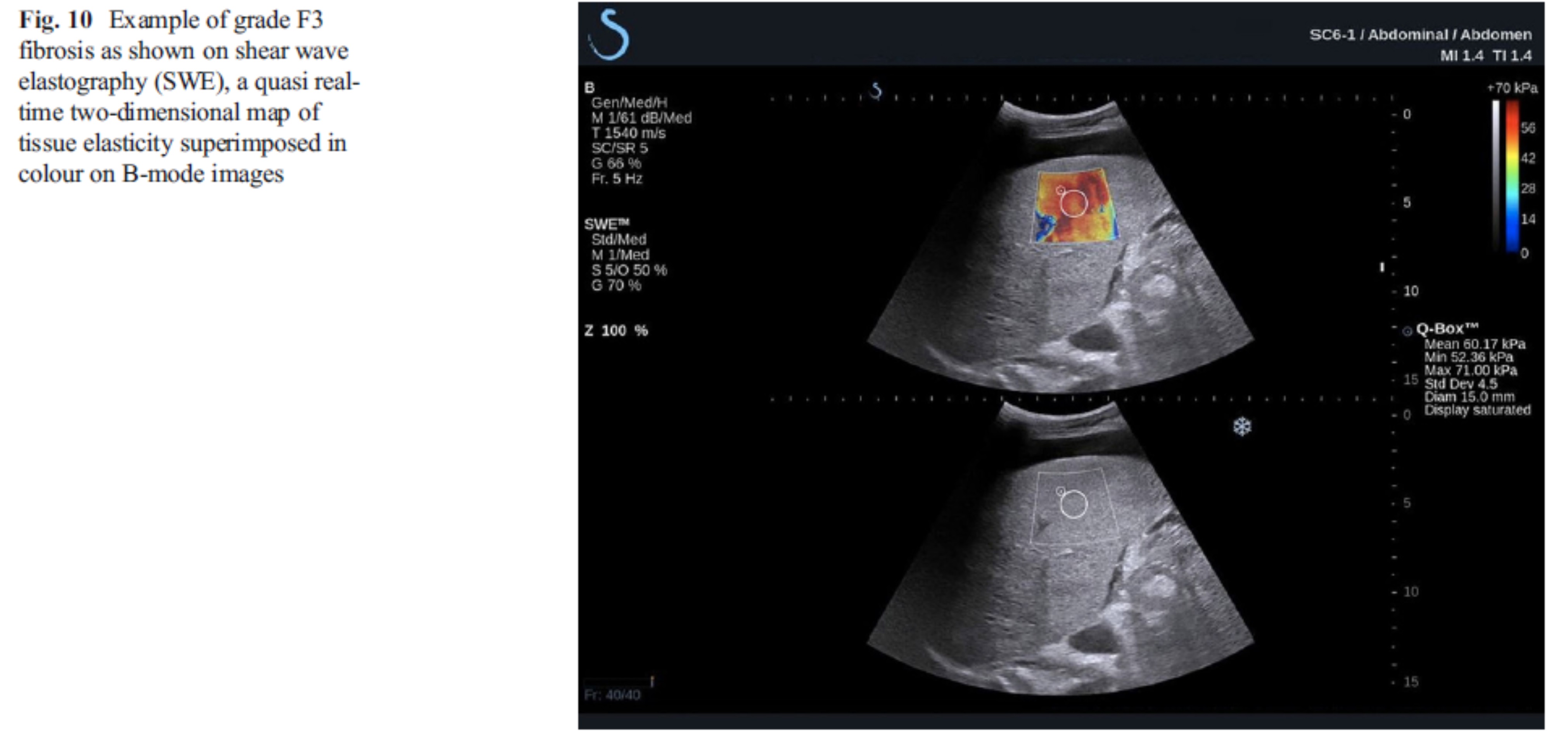 압박과 수직인 방향으로 퍼져가는 파형을 분석하면 전단파탄성영상(shear wave elastography)이라 합니다. 이는 특수 고안된 탐촉자에서 펄스를 발사시켜 전단파를 유도하고, 이 전단파를 분석하는 영상입니다. 앞선 변형탄성영상은 검사자가 탐촉자로 직접 압박하는 방식(manual compression)이어서 검사자 간의 차이가 크고 압박력이 깊게 도달하기 힘듭니다. 그러나 전단파탄성영상은 탐촉자에서 펄스를 발사시키고 상호 작용에 의한 전단파를 분석하기 때문에 검사자 간 변이가 없고 정량화(m/s 혹은 kPa) 할 수 있는 것이 장점입니다.