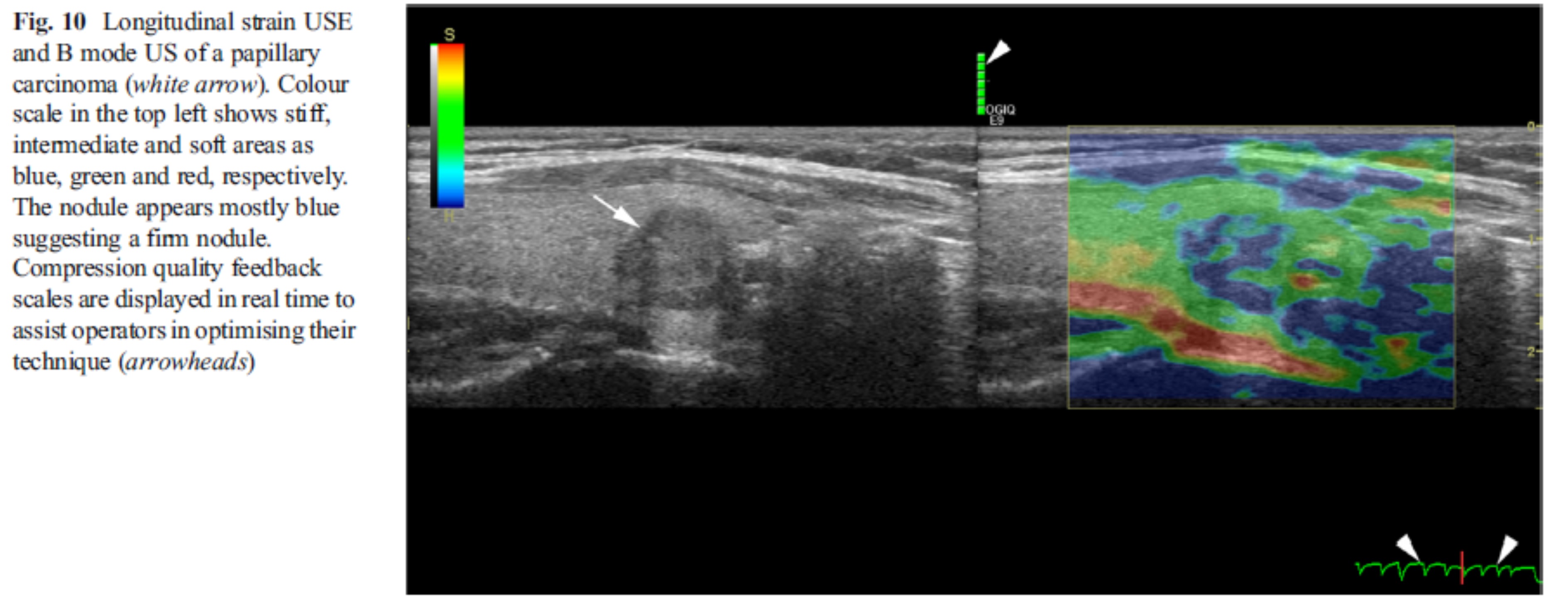 (왼쪽) 변형탄성영상은 직접적인 압박(manual compression)에 대해 밀리는 정도를 표현.