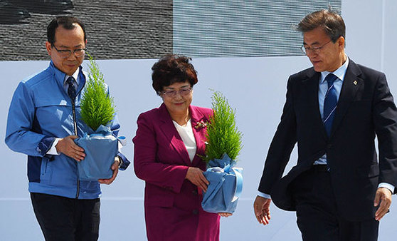 12:52 고리원자력본부장과 고리원자력 폐쇄 활동을 해온 활동가의 화분 교환식에 갑자기 올라와 격려하는 문재인 대통령.