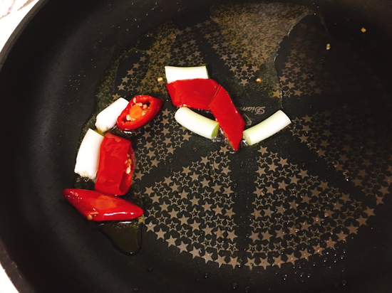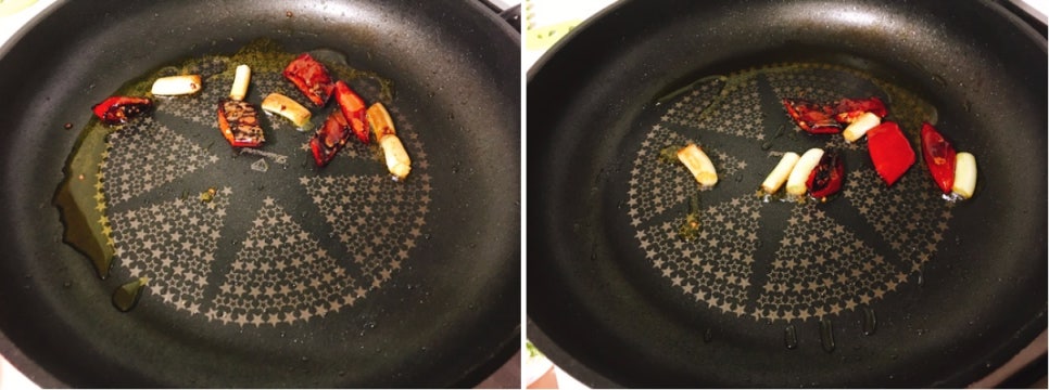 팬에 기름을 두르고 빨간 고추를 넣고 ..