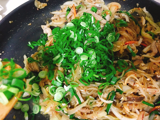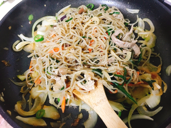 양파가 노릇노릇 해졌다고 생각될때 잡채를 넣고 볶다가