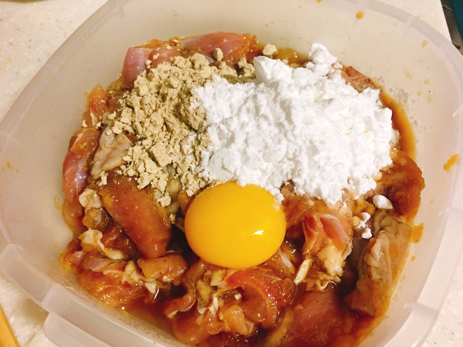 계란 노른자, 전분, 밀가루...를 넣고 튀김 옷을 입힙니다.