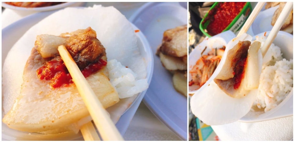 무쌈 위에 고기 하나 올리고!!! 쌈장 찍어서 한입에 앙~